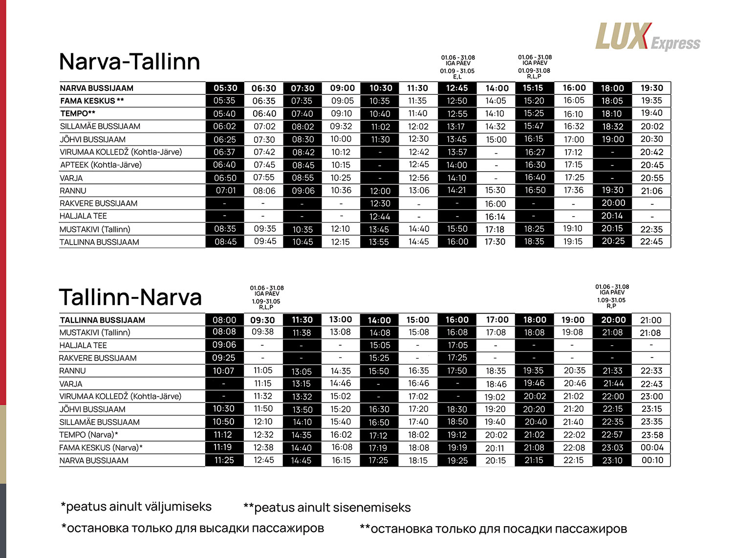 The Narva–Tallinn bus that previously departed at 17:30 will be moved 30 minutes later and will now depart Narva at 18:00. This service will no longer stop in Kohtla-Järve; instead, a stop in Rakvere has been added at 20:00. According to the new timetable, this will be the latest departure from Rakvere to Tallinn.