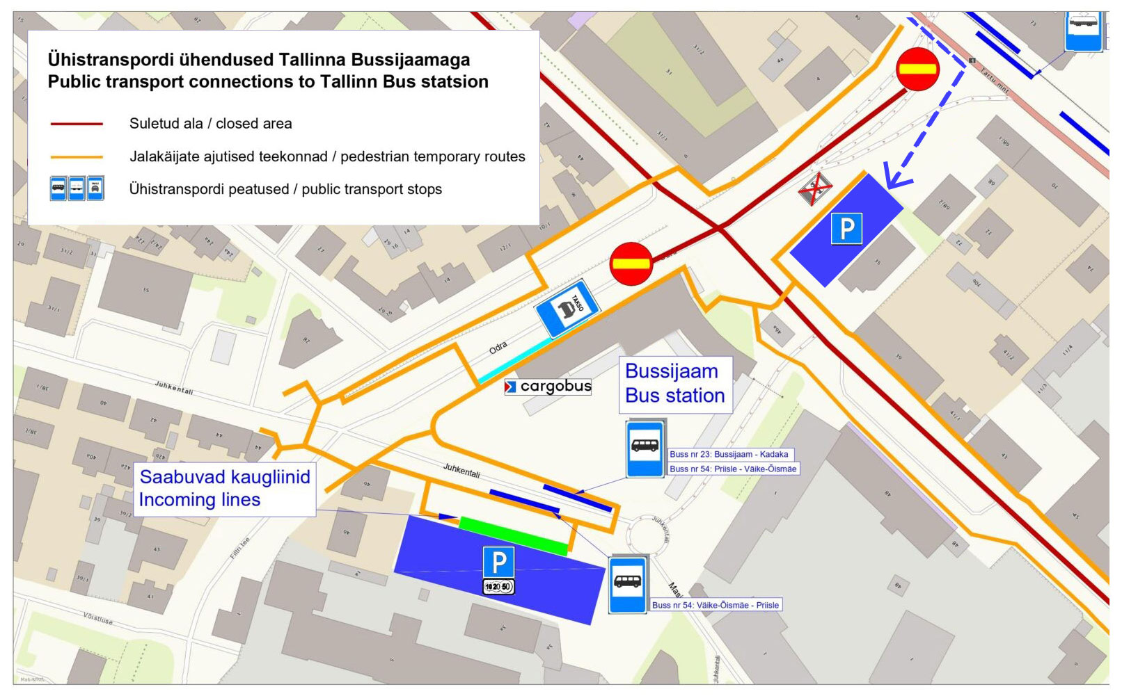 Access to Tallinn Bus Station will be available via temporary pedestrian routes, public transport, and a taxi stop, as indicated on the provided map. Additionally, the parking lot at Juhkentali 48 can be used.