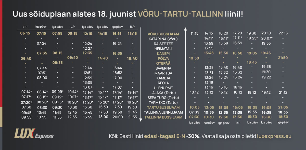 Starting from June 18, Lux Express is adding several new departures to its schedule, offering improved connections between Võru, Põlva, and Tallinn. These new routes will provide passengers with convenient early morning and late evening travel options, making trips to and from the capital smoother for those in Southern Estonia.