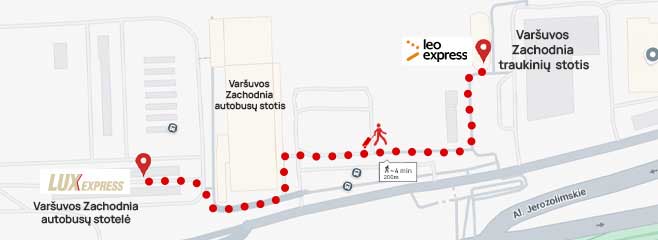 Autobusas atvyksta į Varšuvos Zachodnia autobusų stotį, o traukinys išvyksta iš Varšuvos Zachodnia traukinių stoties, esančios maždaug 320 m atstumu.