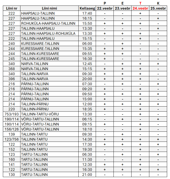 + Buss sõidab sel päeval / - Buss ei sõida sel päeval
