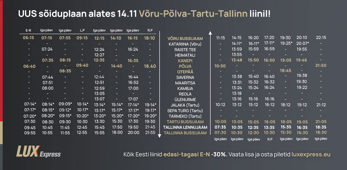 Alates 14. novembrist muutub kahe Võru–Põlva–Tartu–Tallinn reisi sõiduplaan.